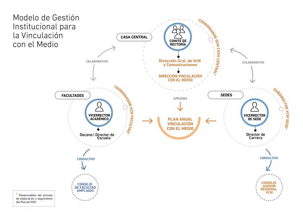 El modelo de gestión del plan anual se ejemplifica en la siguiente figura, donde se muestra el rol de las facultades y sedes, a través de los coordinadores de VcM, y las sedes, a través de sus subdirectores de VcM. En Casa Central la Dirección de Vinculación con el Medio da los lineamientos y coordina este proceso y otros.